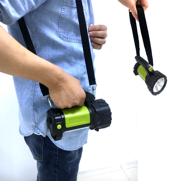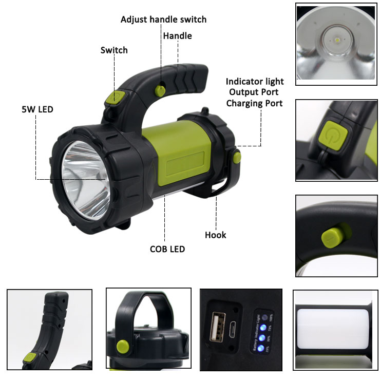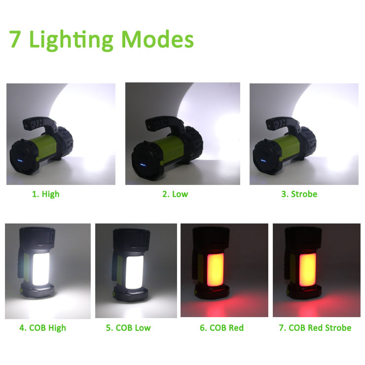 Light source: 5 Watt OSRAM LED & COB Brightness: 300 lumens Material: ABS + PC Battery: 2*1200mAh Li-ion rechargeable battery